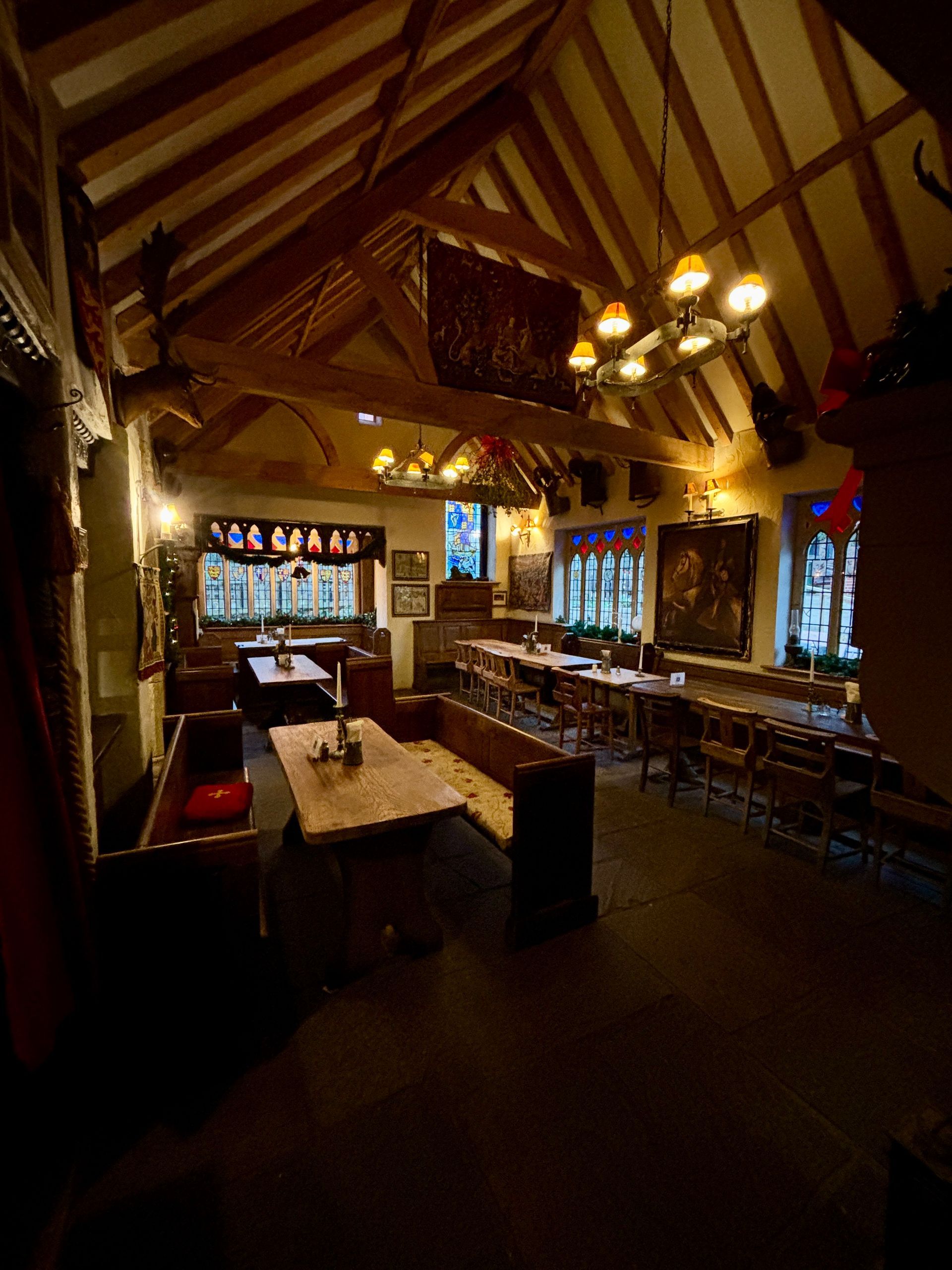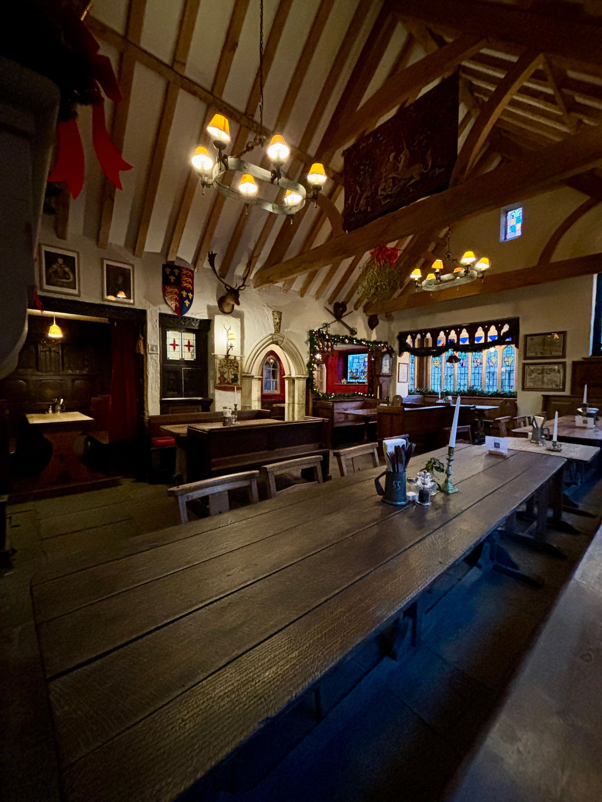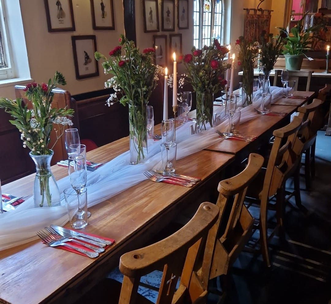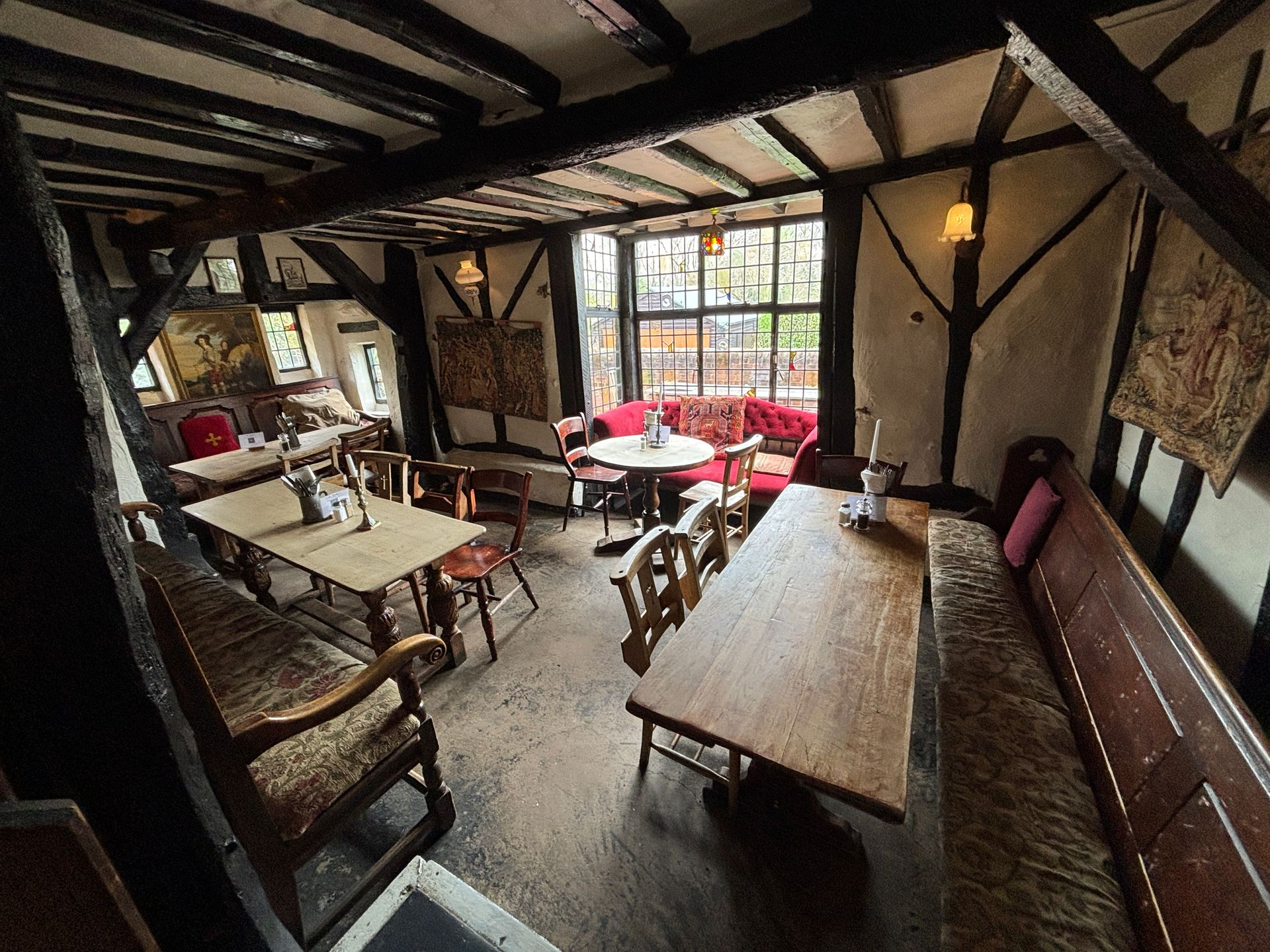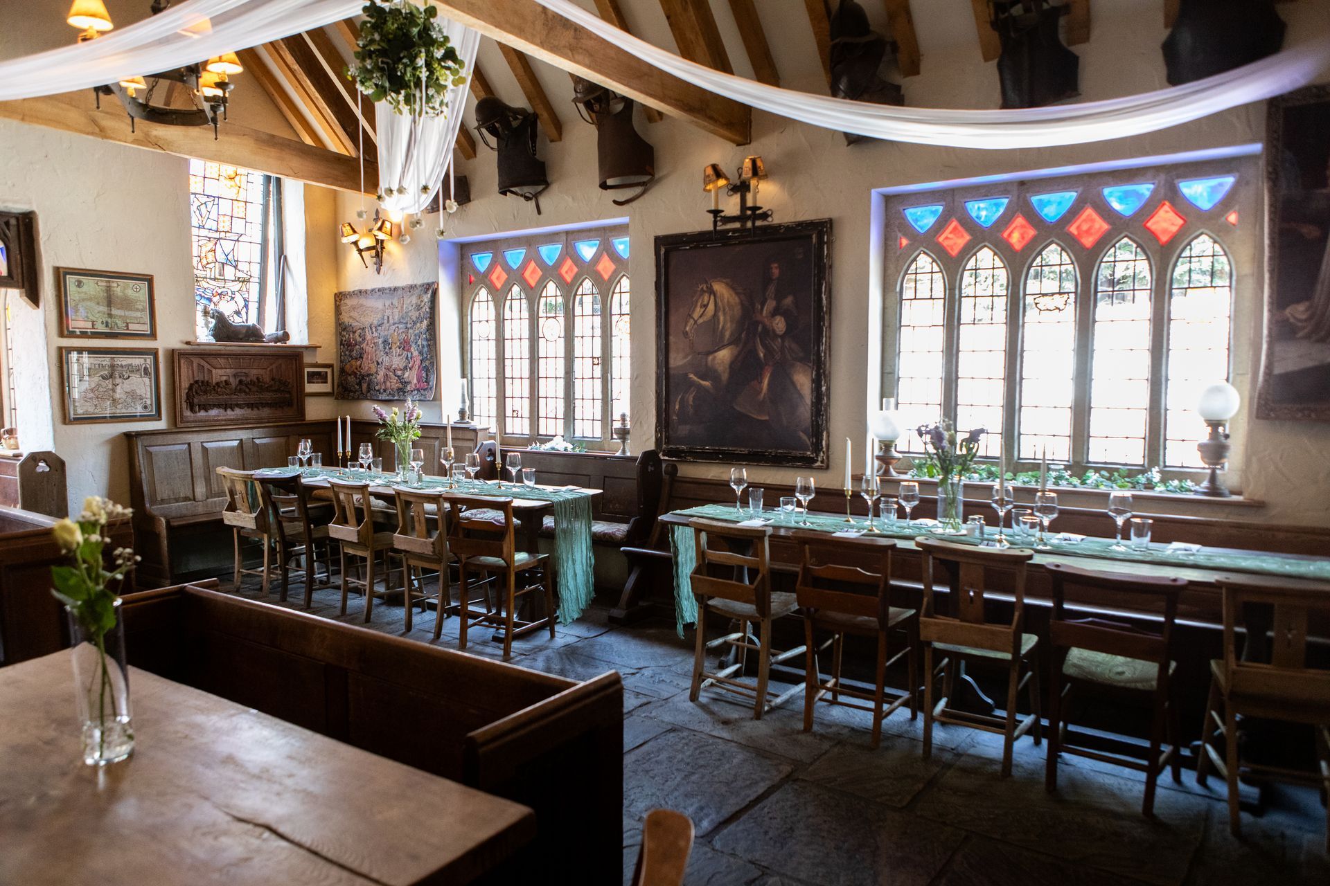 The hall itself can seat 50, and the table in the alcove with red walls can seat a further 10 guests