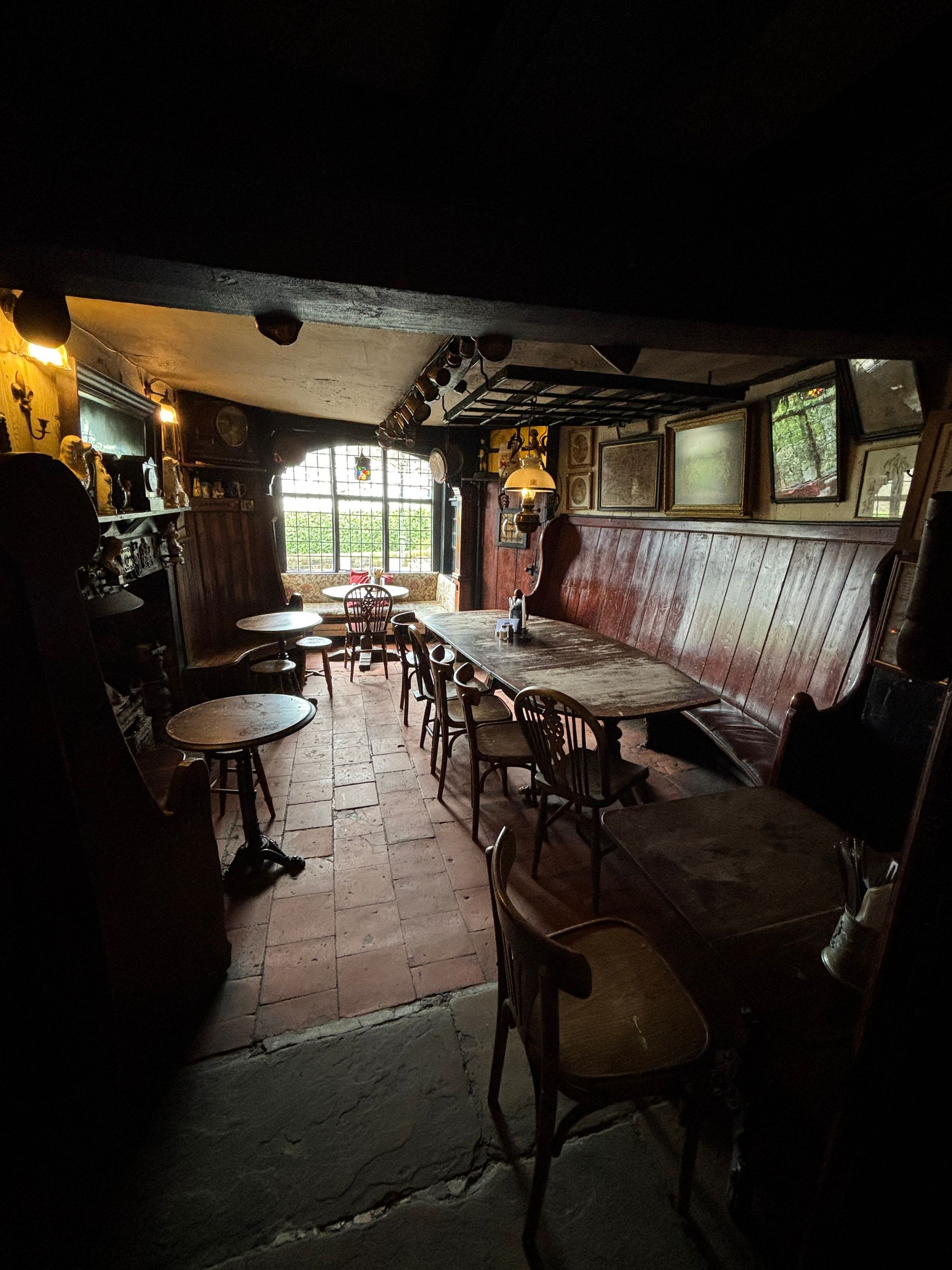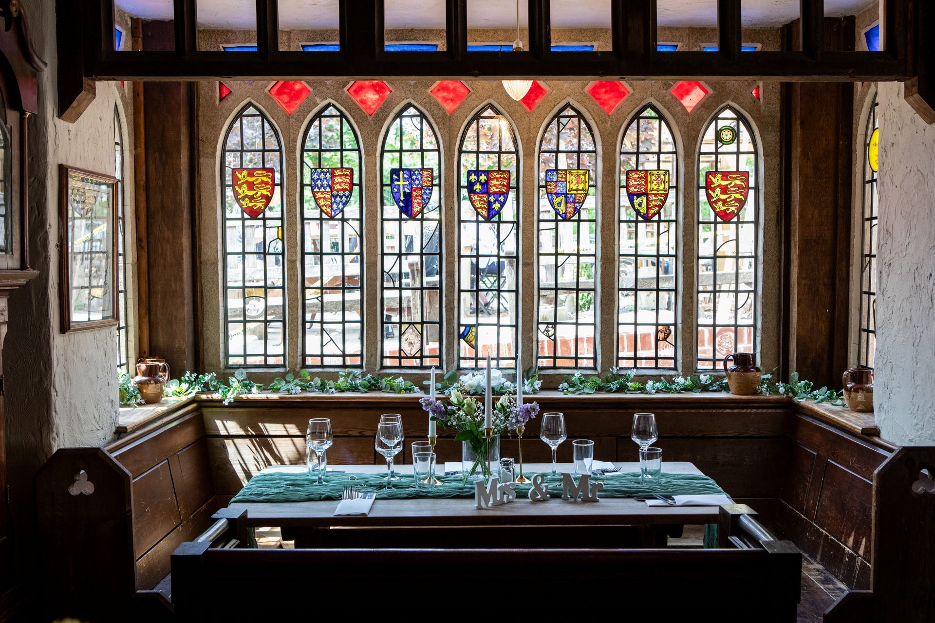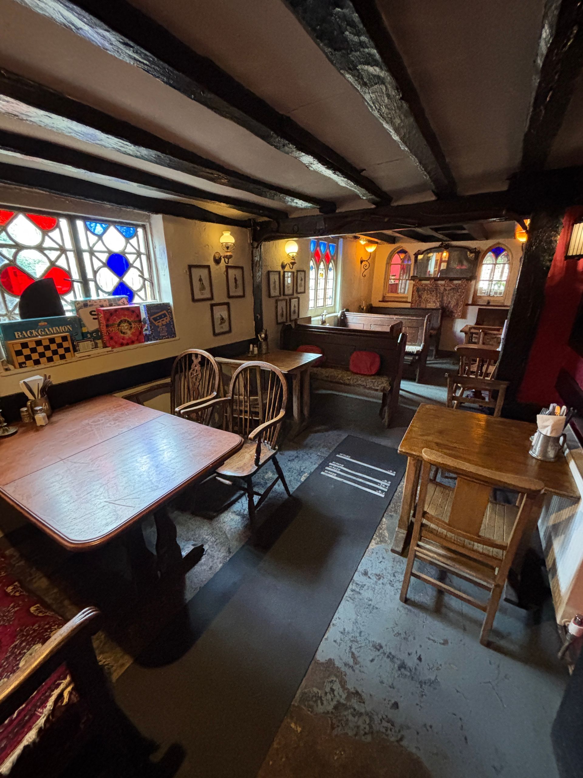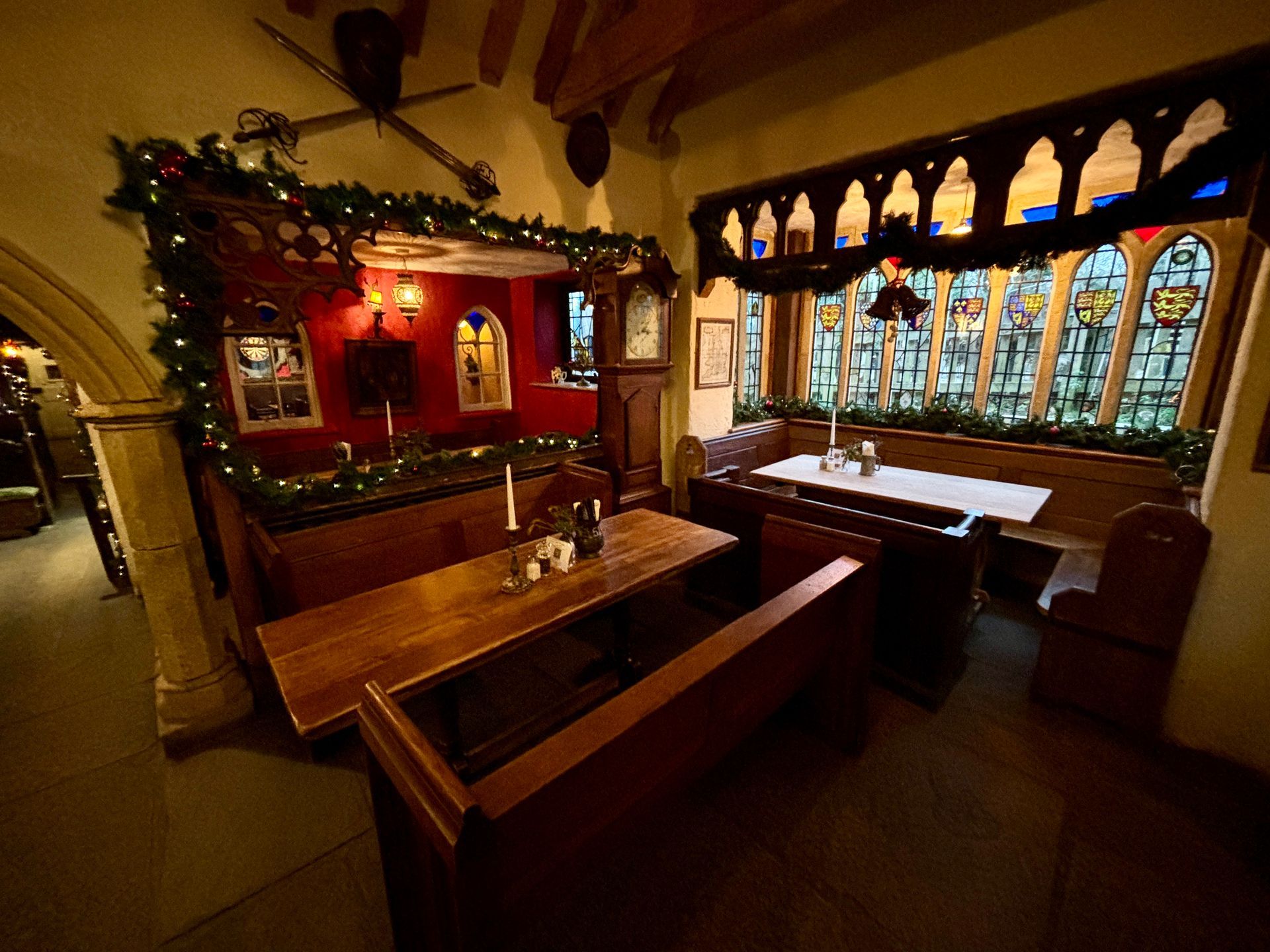 The hall itself can seat 50, and the table in the alcove with red walls can seat a further 10 guests